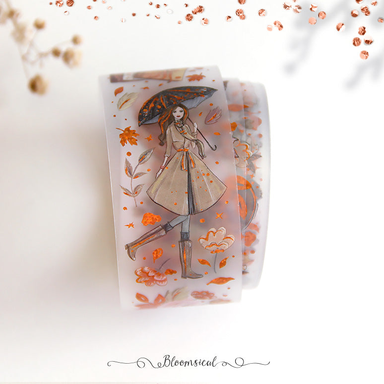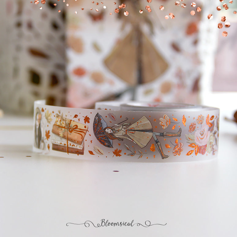 A limited edition PET tape roll, the material is transparent matte with Confetti Copper Foil finish.