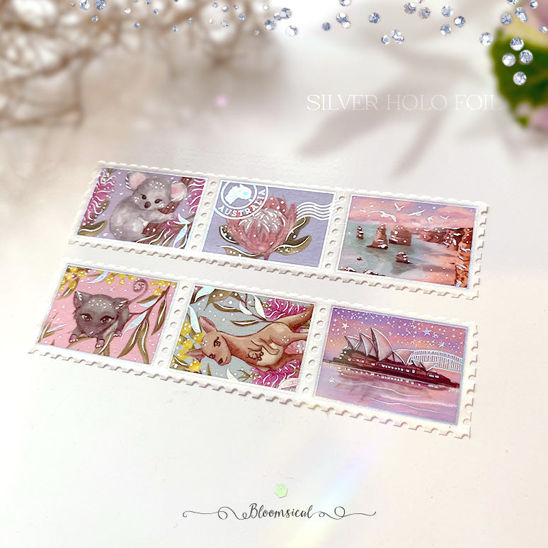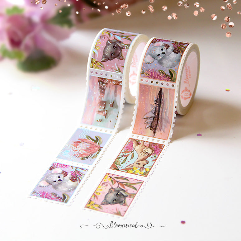 An exclusive stamp washi tape roll featuring 6 repeating designs.