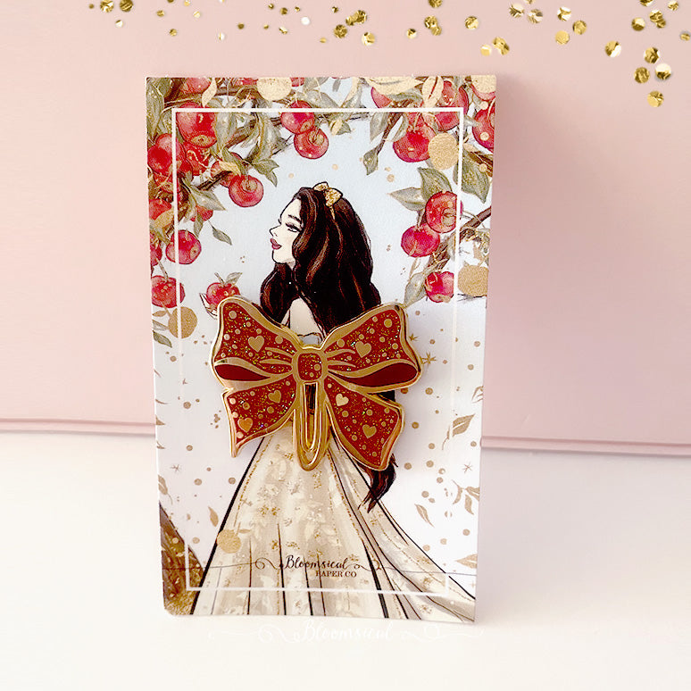 Colorful Glitter Bow Clip Enamel Pin - Red + Gold