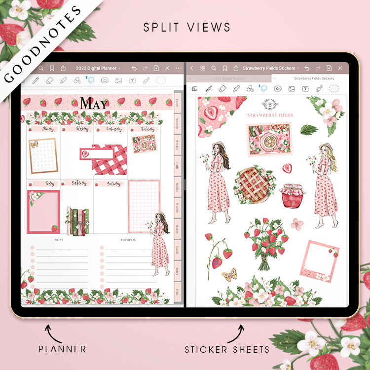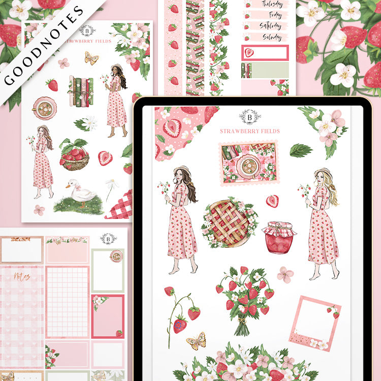 ♡ 1 Goodnotes file with pre-cropped images. 4 pages of digital stickers:  2 large deco pages, 1 sticky notes & boxes page, 1 headers and washi strips page